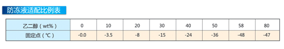 ③最有效的方法是在密闭系统内加注防冻液,乙二醇或丙二醇液即可,加注比例表可参照下表,具体实施防冻措施请与我公司共同制定方案。